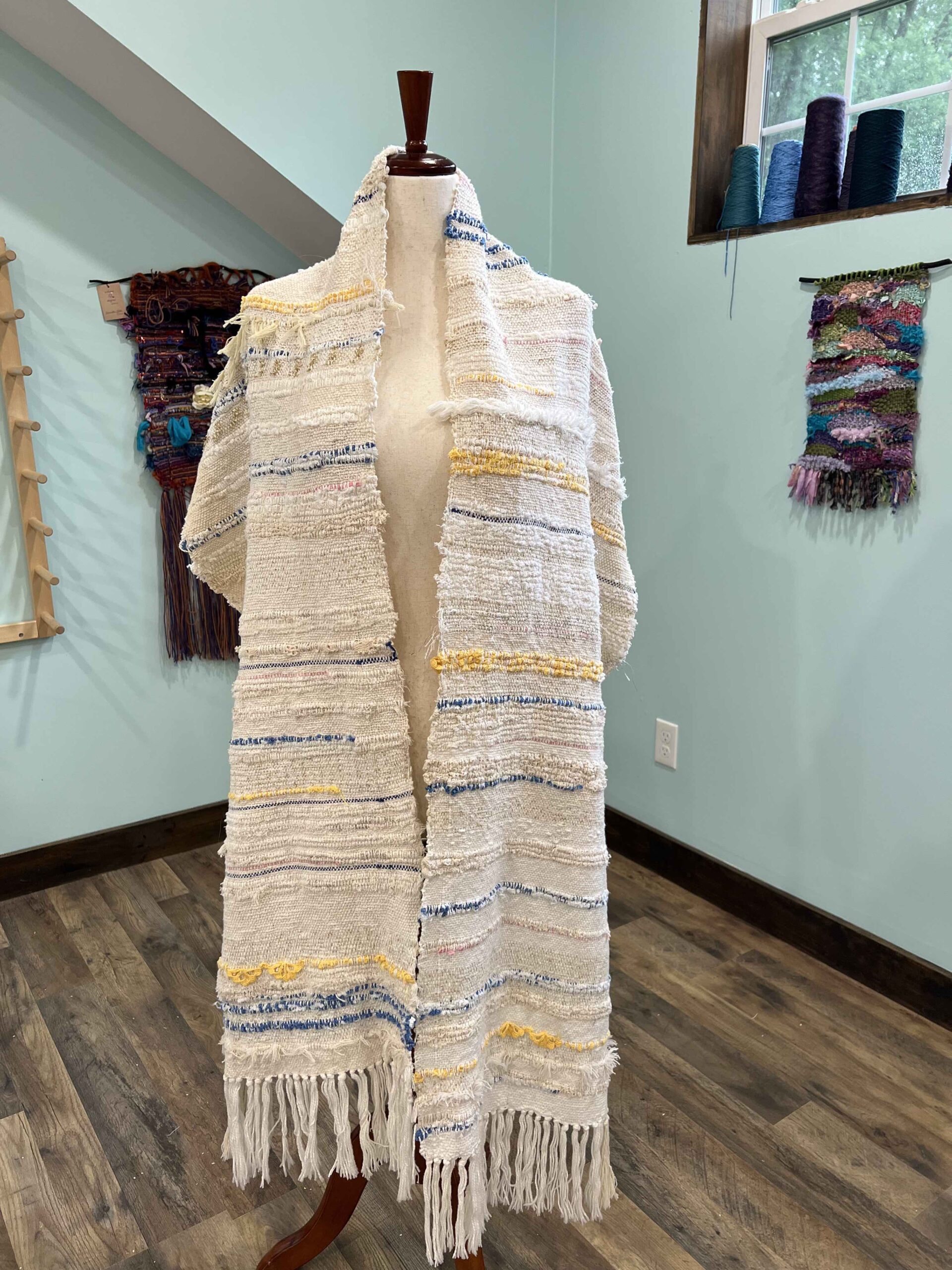 The wrap you see was made from memorable clothing, one ocean tapestry includes the collector’s shells, the other both shells and dried flowers, and the chakra tapestry was made from the hand-dyed fiber of the collector. The longer warp is a piece created for a bride to be using fabrics passed down through her family line. The yellow and orange shawl is a celebration shawl created for a birthday. What could you have made just for you?