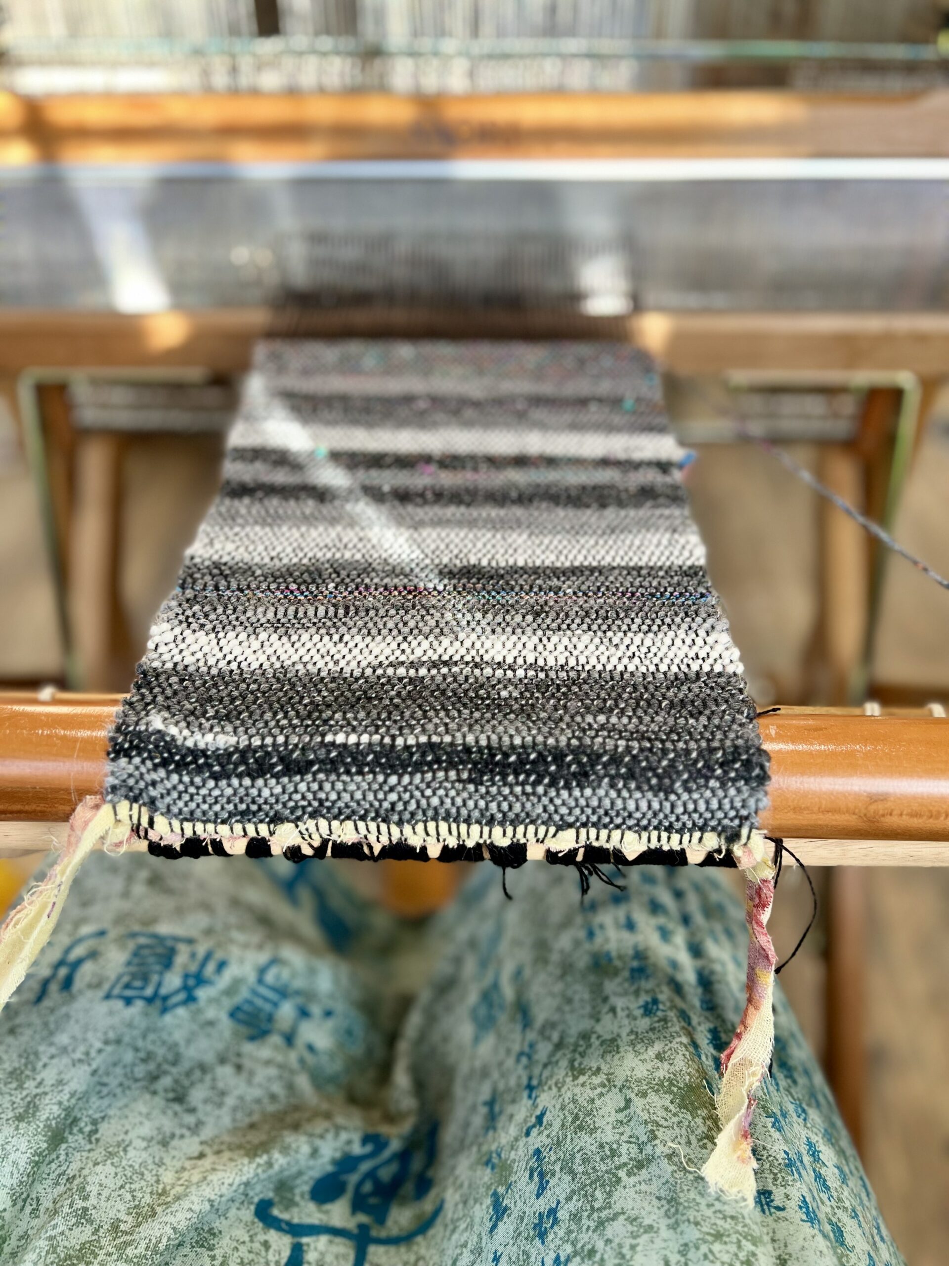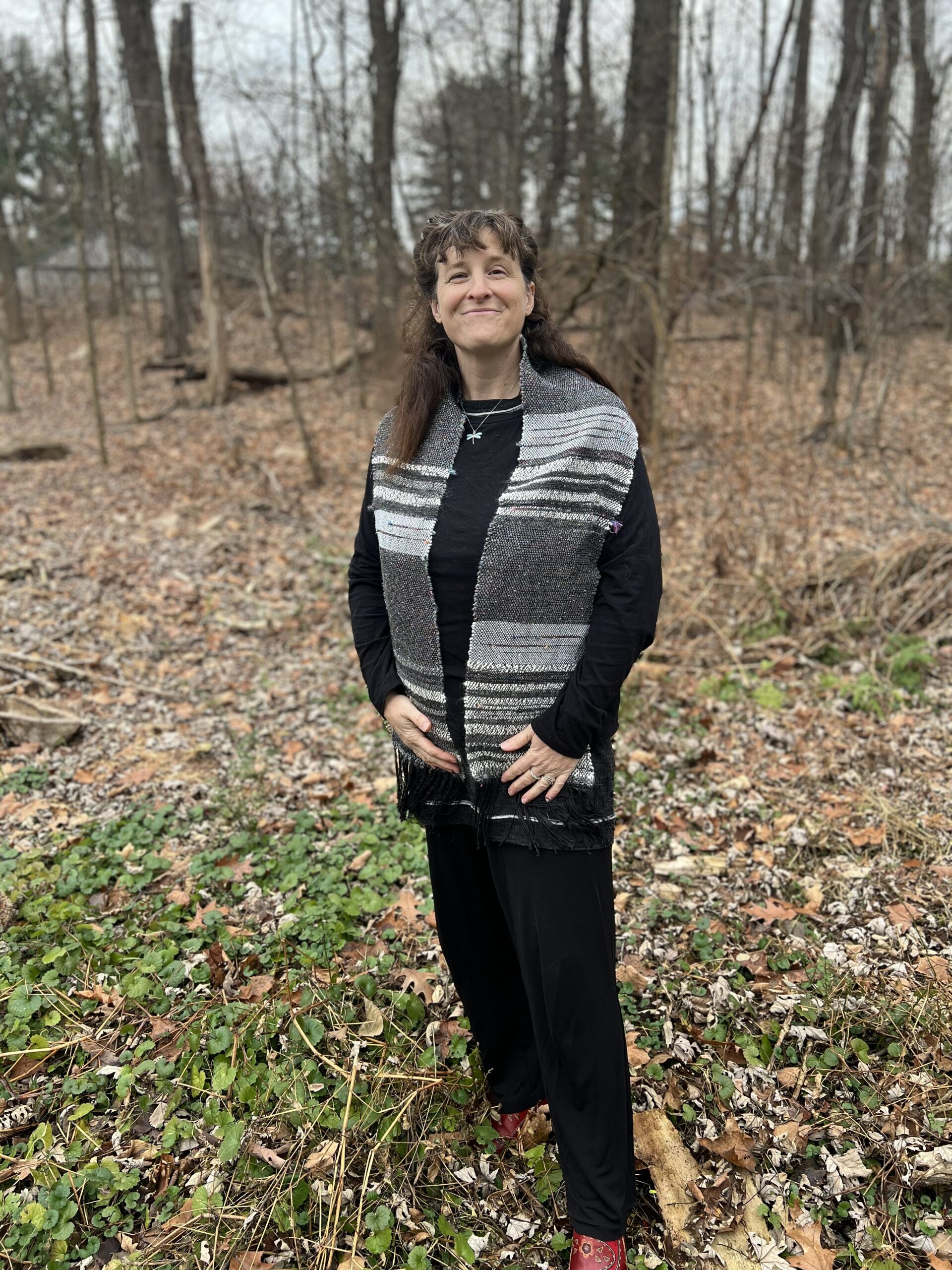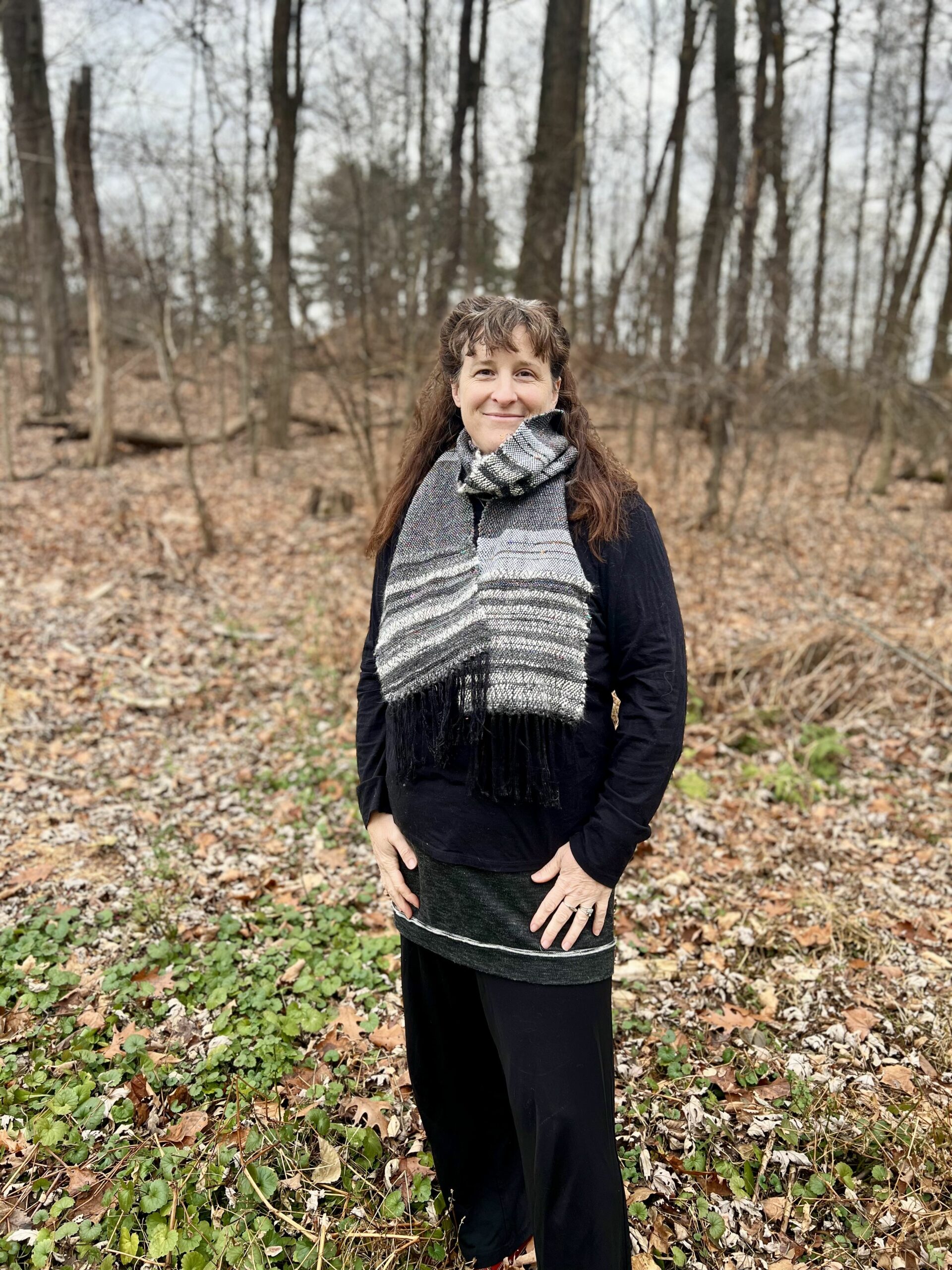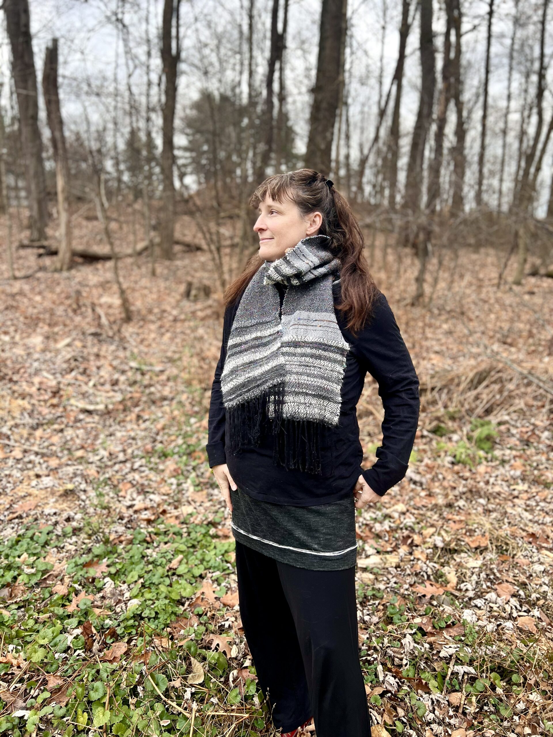 Want a scarf to go with everything? A scarf to go with anything? Both light weight and soft, in gray, black and white neutrals, it has subtle shimmers of color throughout making it versatile, sophisticated and interesting. Woven on a cotton warp from a combination of my own and a fiber farmer friend’s handspun wool and silk, it is a joy to wear.
