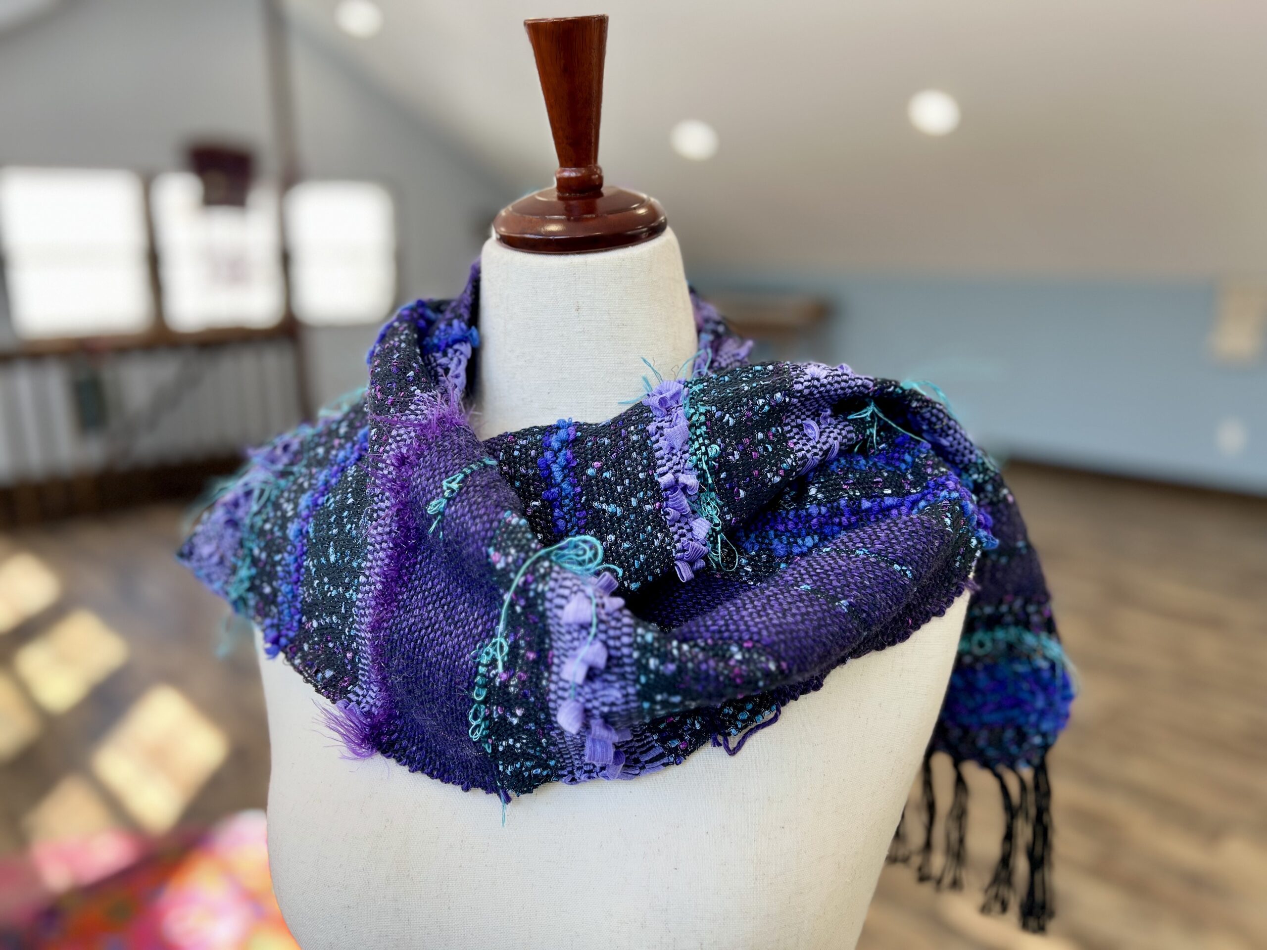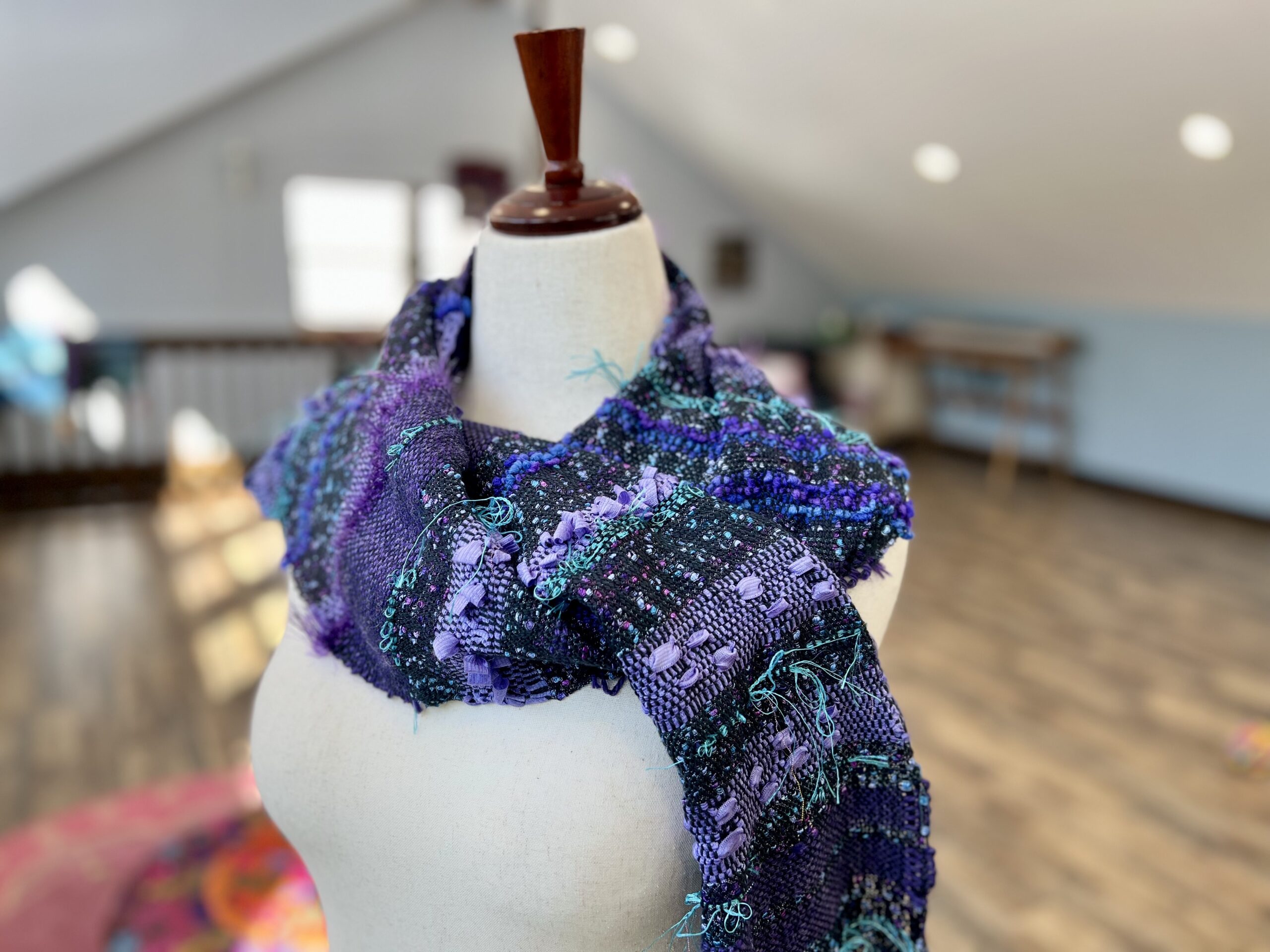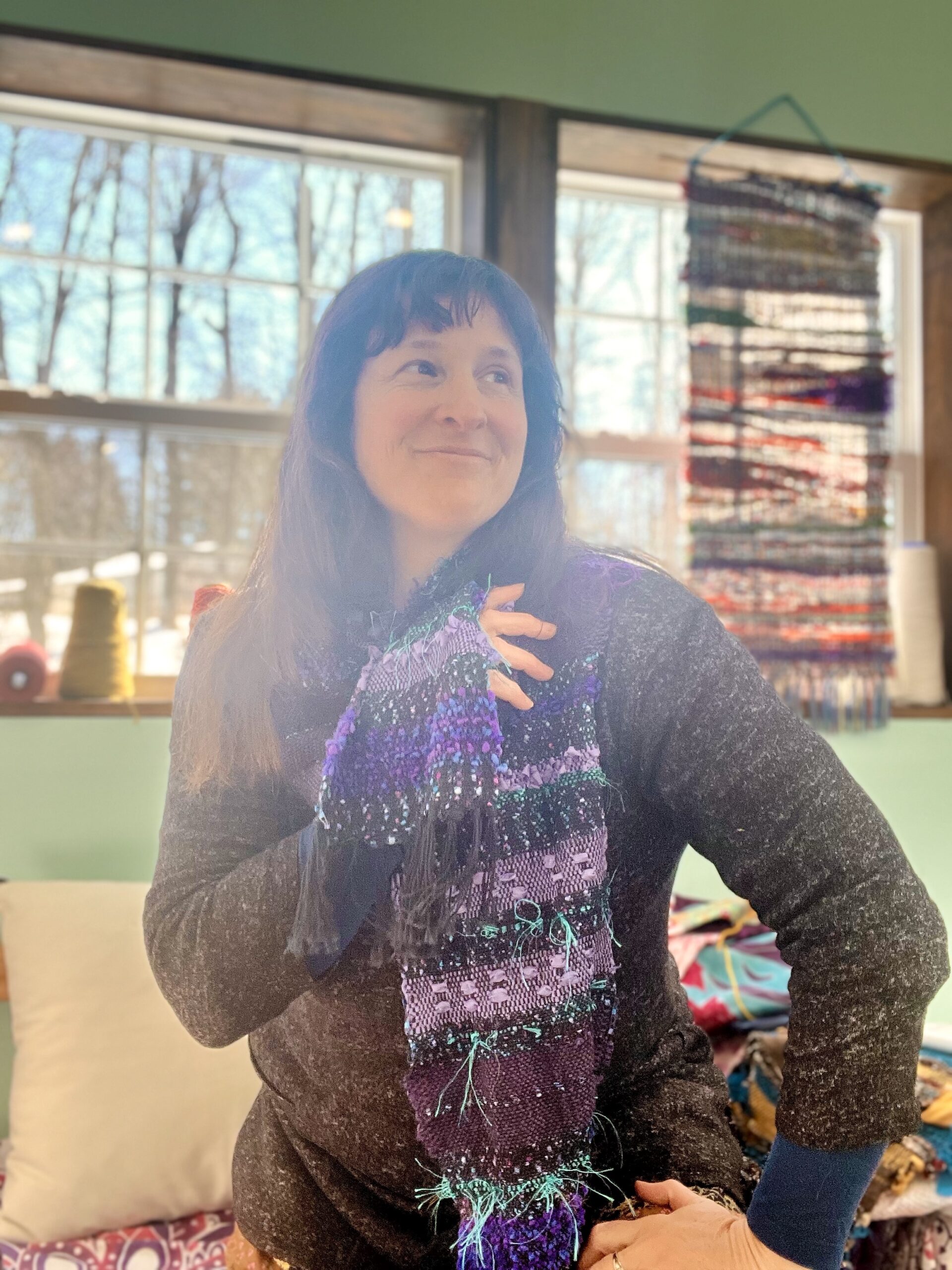 The scarf you see in the photos is only a sample. Yours will be totally original to you. When you purchase, please put in the notes 1. your favorite color, or colors you don’t like OR your birthdate (no year necessary) or 3. something that feels important about you. No need to give lots of information! This scarf is different than a custom order as what you will receive will be a surprise to you–and to me!
