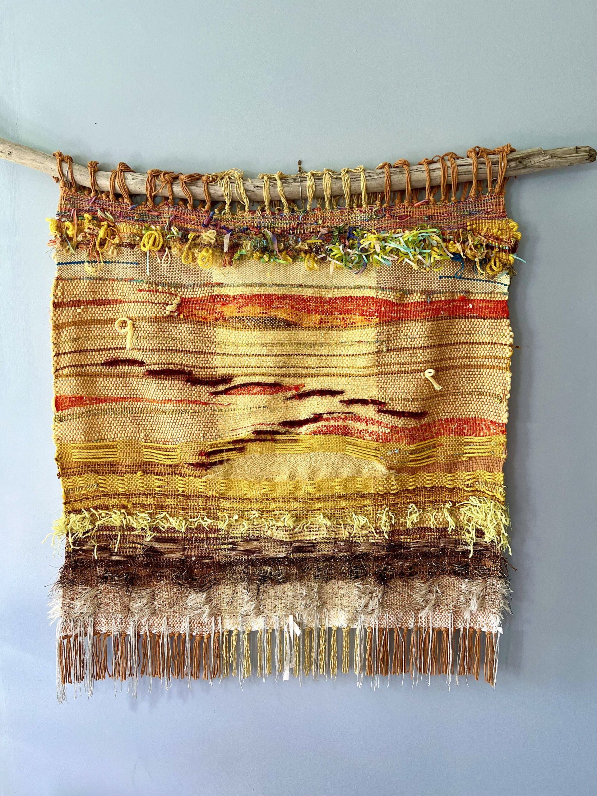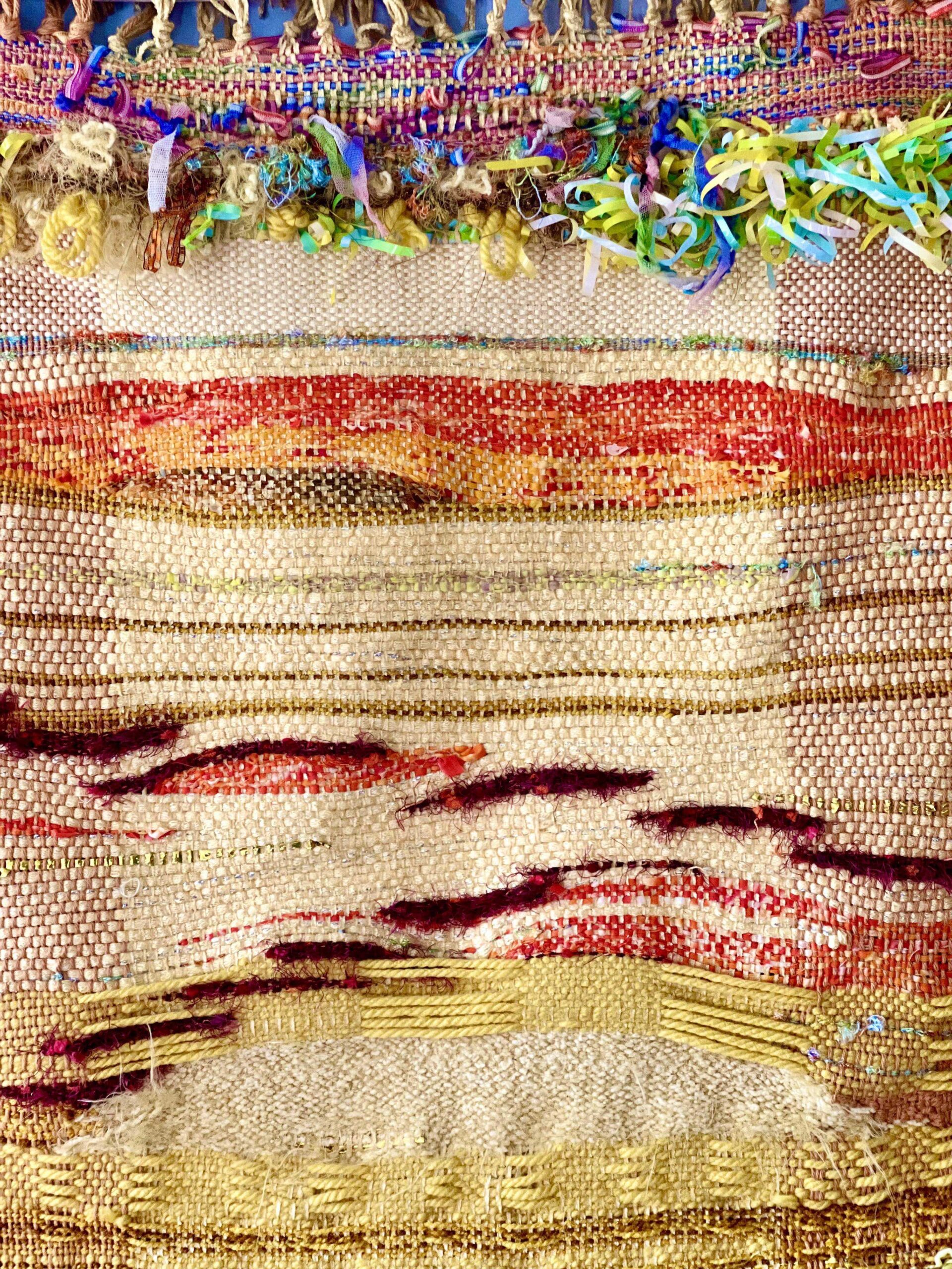 This tapestry is more of an experience than the image can share. It has an incredible story of being lost on the way to California for a juried art show…and then being found. But even before that happened, it had a story about the light that is always present, about the rich darkness that is the same as light. It greets you with the energy of sun and life, a guiding light that never fails. It will fill your space with its special gift of ever present light.
